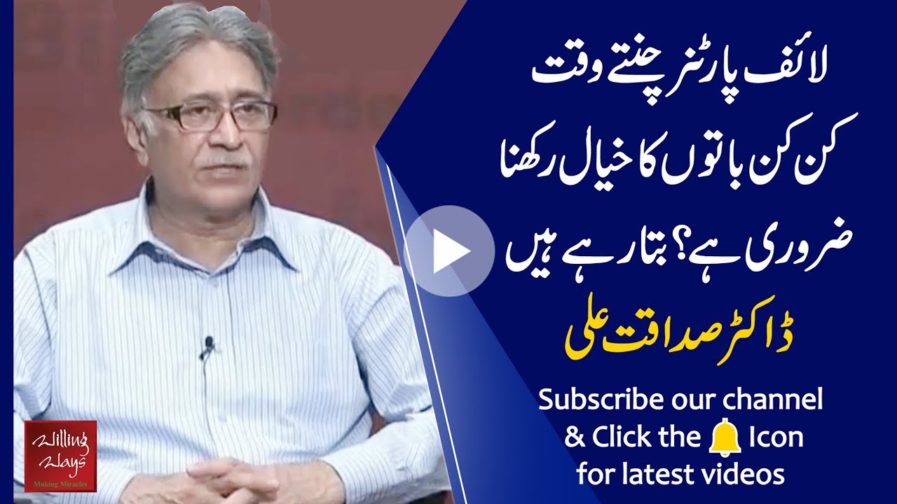 What are the things to keep in mind when choosing a life partner? کیا گورا چیٹا رنگ، بادامی آنکھیں، اونچا قد شادی بیاہ کے معاملے میں یہ سب چیزیں دیکھنا ضروری ہیں؟ کیونکہ حُسن کے ساتھ ساتھ اگر حُسن اخلاق بھی ہو تو کیا ہی بات ہے۔ اپنا لائف پارٹنر چنتے وقت کن کن باتوں کا خیال رکھنا ضروری ہے؟شادی میں میاں بیوی کا ایک دوسرے کے ساتھ رہنا سیکھنے کا کام ہے۔ اپنے لائف پارٹنر کو جانچا پرکھا کیسے جائے؟ بتارہے ہیں ڈاکٹر صداقت علی اس ویڈیو میں۔ دیکھیں شیئرکریں۔۔